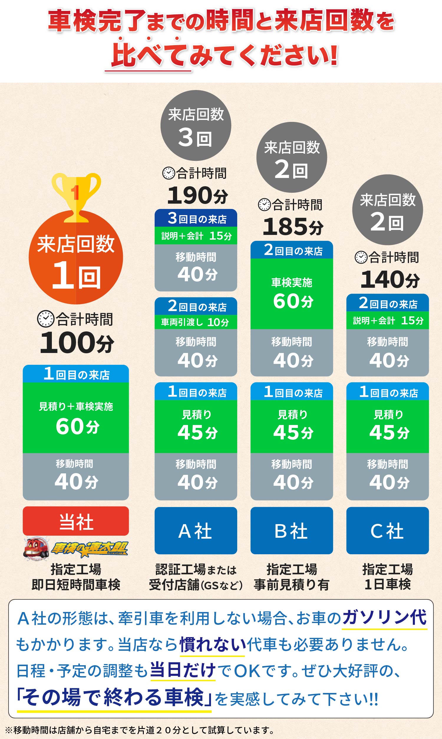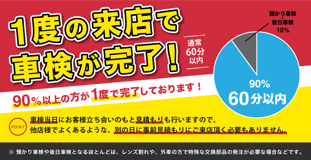 当店は、短時間車検を基本としておりますが、整備箇所が多い場合や部品取り寄せが発生した場合など、短時間で車検が完了できない場合も中にはございます。